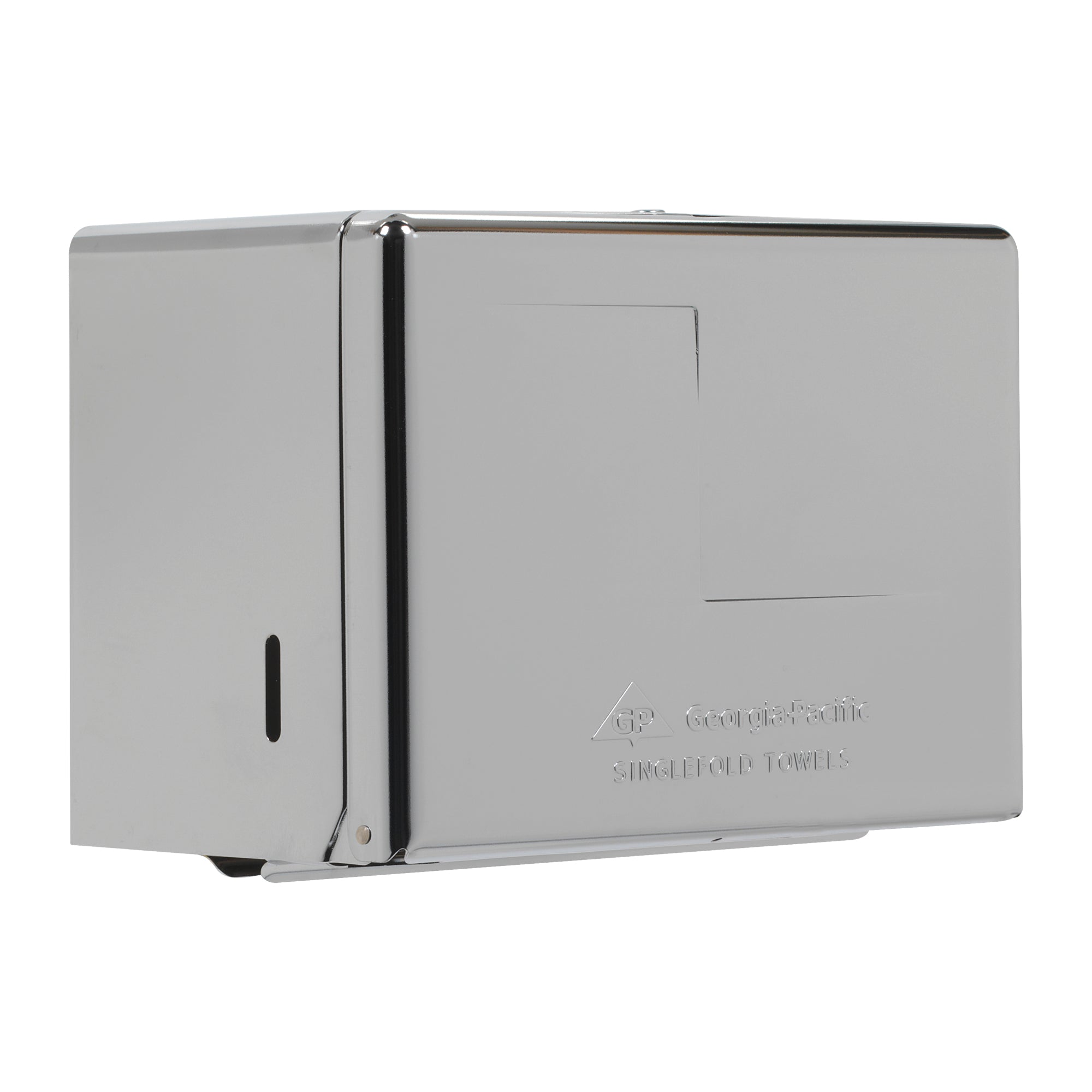 מתקן מגבות נייר יחיד של GP PRO הוא מתקן מגבות פלדה חוסך מקום המחזיק עד 500 מגבות חד פעמיות תוך מתן הגנה מפני לחות ומזהמים ממשטחי השיש. הפלדה בצבע הכרום משלימה כל תפאורה ואילו מנגנון נעילת המפתח המכוסה מגן מפני פסולת וגניבה. העיצוב הפשוט שלו הופך את מילוי המגבות למהיר וקל, וממזער את הזמן המושקע בתחזוקה.