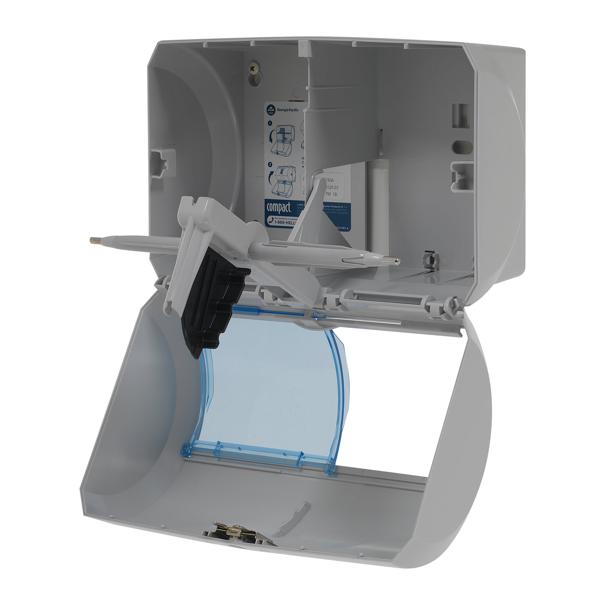 מערכת חלוקת נייר טואלט עם גליל כפול אטרקטיבית מסדרת Compact® המספקת קיבולת של עד פי שישה מגלילים דו-שכבתיים סטנדרטיים, תוך שמירה על המראה המקצועי. מתקן זה מספק 3000 גיליונות של רקמה דו-שכבתית איכותית או 6000 גיליונות חד שכבתית, לשירות רציף ולשביעות רצון מוגברת של אנשי התחזוקה. מתקן זה כולל משוט העברה למניעת גישה לגליל חדש לפני השימוש במלואו של הגליל הנוכחי, ומציע את אחד הפתרונות החסכוניים ביותר לחלוקת נייר טואלט בקיבולת גבוהה.